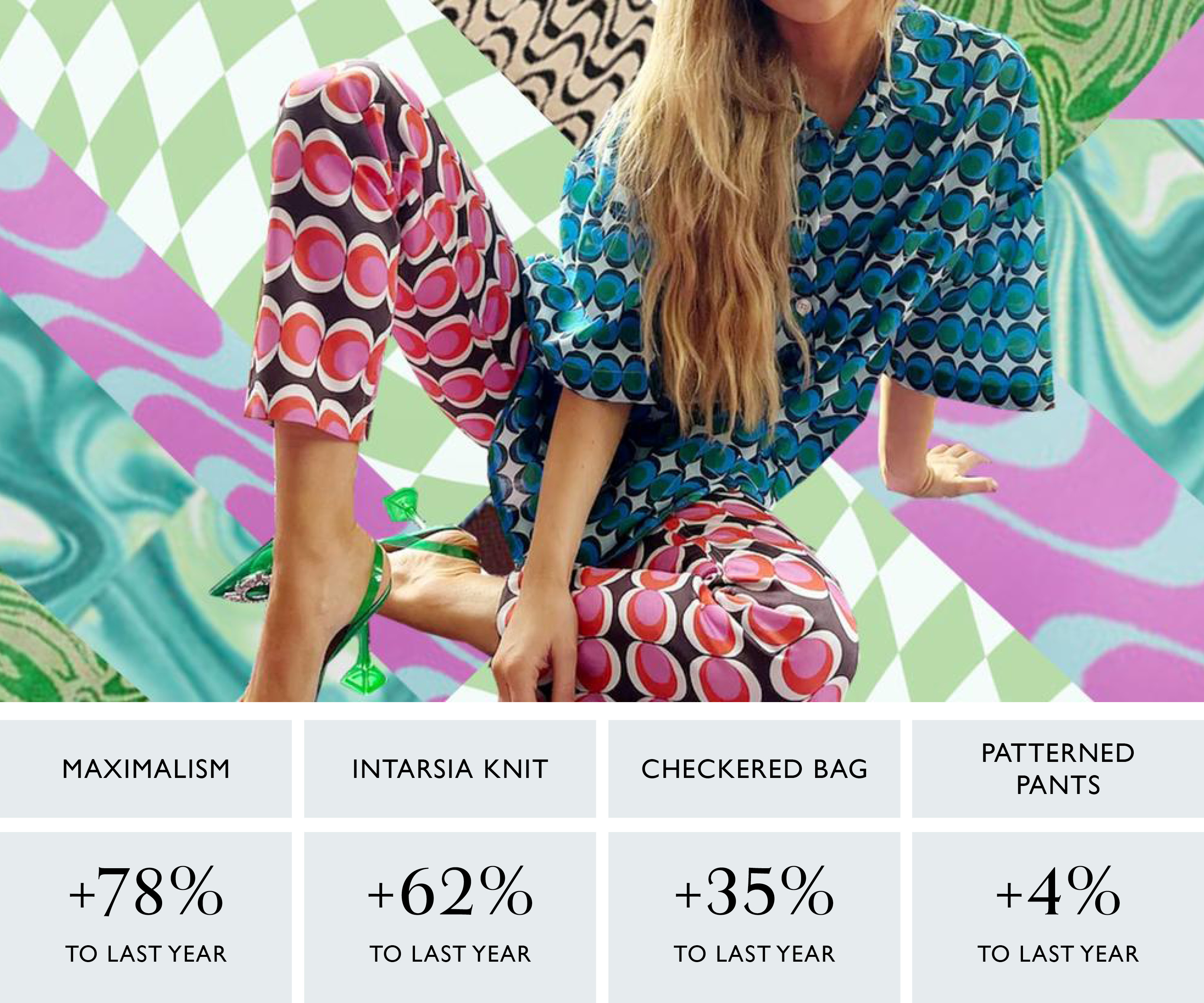Colorful patterns and standout accessories bring maximalism to the modern consumer. Patterned pants (+4% to LY) from Gimaguas, Holiday The Label, and Hosbjerg have quickly become cult favorites, while intarsia knits (+62% to LY), a safe bet, offer an eye-catching alternative to a wardrobe staple. Rounding out an ig-worthy fit, checkered bags (+35% to LY) and clay rings (+1,252% to LY) make an instant and long-lasting impression.