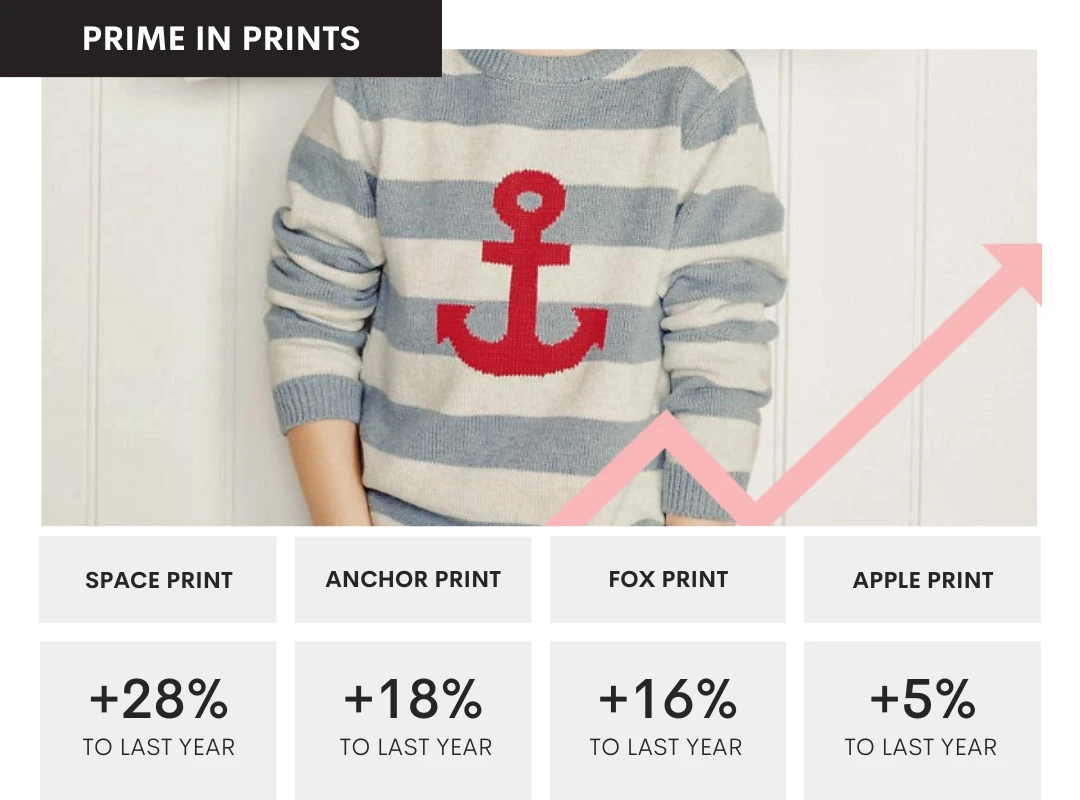 Childrenswear is notorious when it comes to prints. Perfect for summer, anchor prints (+18% to LY) are an emerging trend mostly saturated in the luxury market. Fox prints (+16% to LY) and apple prints (+5% to LY) are kid top picks too, popularly sold at Farfetch. Experiencing accelerated growth, space prints are +28% to last year and will continue to grow throughout the year.