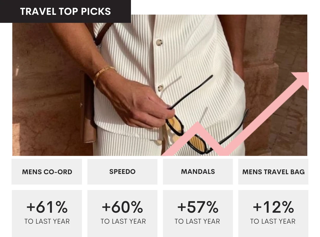 With warmer weather brings with it a travel boom. The mens travel bag is an emerging trend growing in the market with +80% market adoption to last year. Mens co-ord sets (+61% to LY) and mandals (+57% to LY) are vacation must-haves along with the speedo, growing at accelerated rates, up +60% to last year in searches.