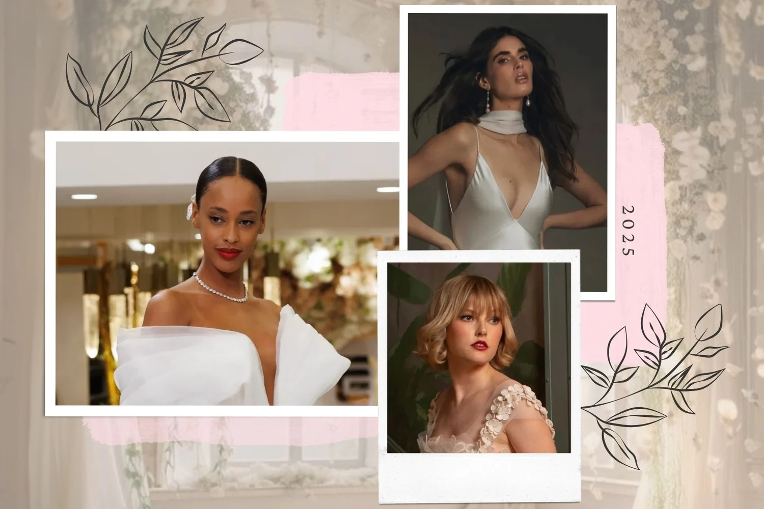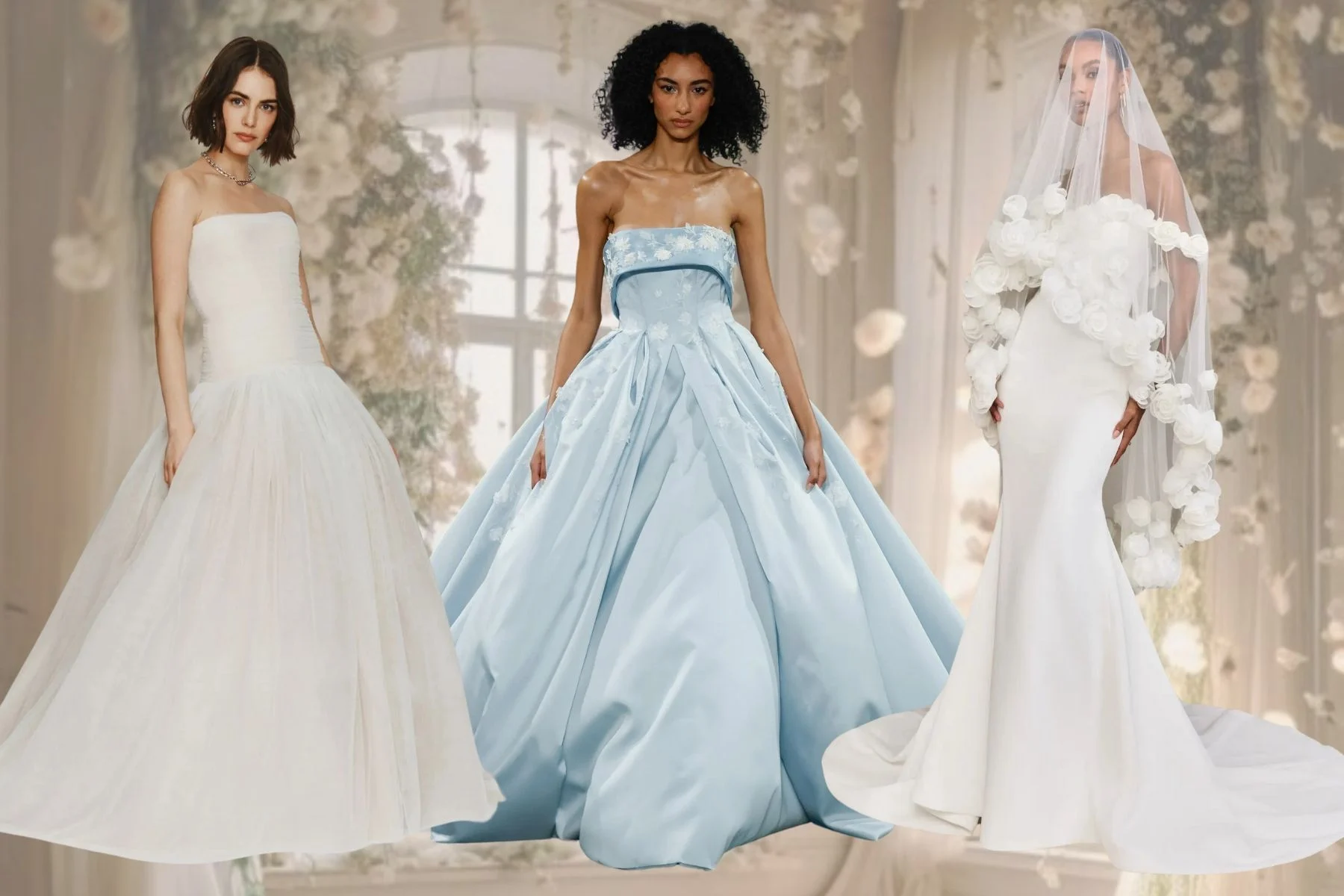 The drop-waist wedding dress was a standout of the season as vintage styles are making their way back into bridal wear. This dress is already seeing growth within the market––especially with drop waists saturating contemporary womenswear––and average weekly searches are up +60% to last year. Bubble hem gowns further elevated modern shapes in bridal dresses seen at Monique Lhuillier and Katherine Tash. Bubble hems are experiencing accelerated growth and products in the market are +73% to last year. This style is especially popular for its whimsicality and is often seen in mini dresses that are perfect for after parties and receptions. More and more, brides are opting for several wedding looks that feel personalized to their personal style and vary throughout the slew of wedding events rather than sticking with one gown for the entirety of the day. Because of this, designers made 2-in-1 looks using detachable sleeves, overskirts, toppers and adjustable draping so brides can have it all with the purchase of one dress. These convertible gowns hid a mini wedding dress (+38% to LY) or jumpsuit (7k AWS) underneath layers that can later on be removed.