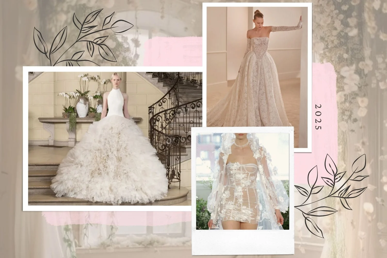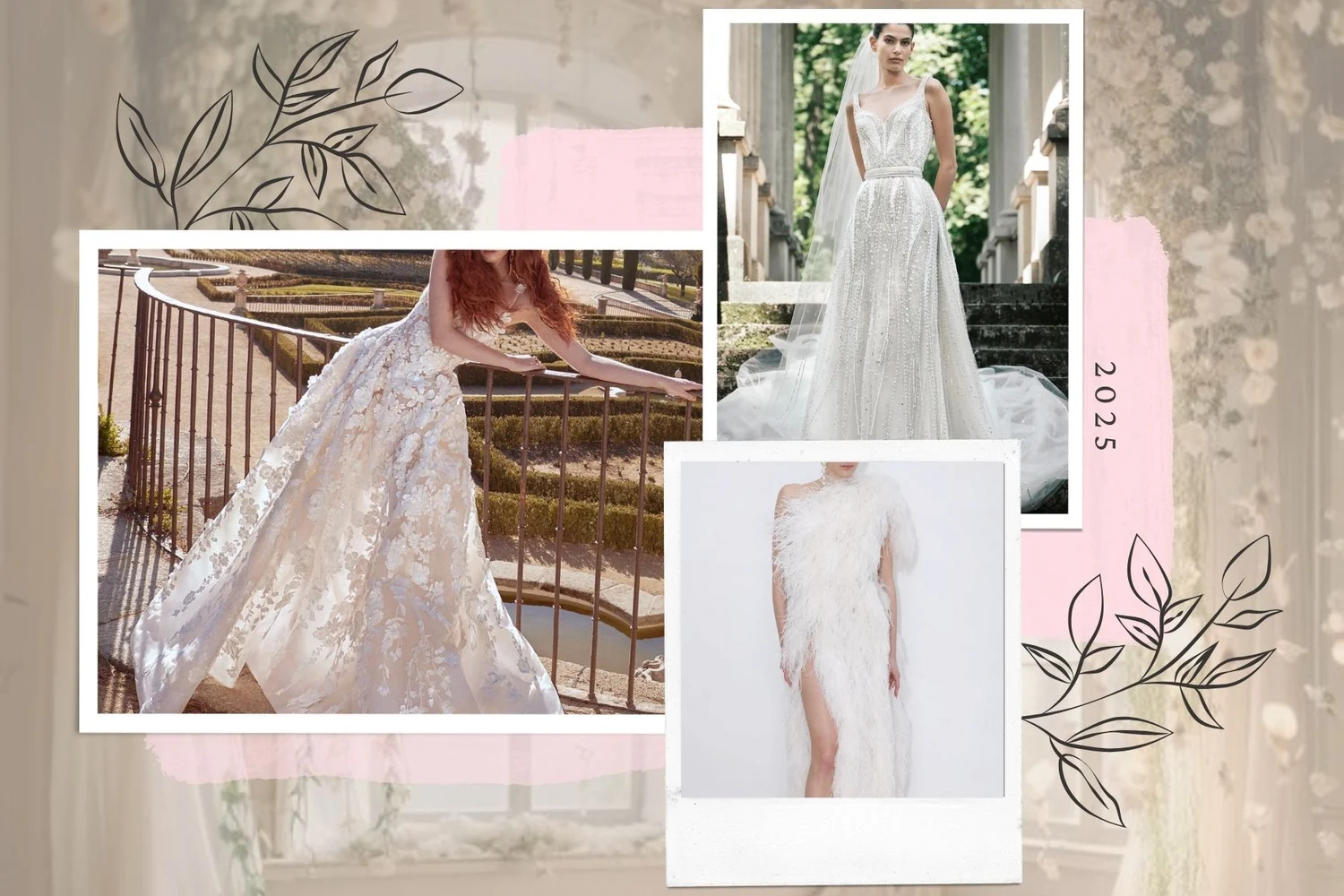 The primary design details seen this bridal fashion week revolved around femininity and luxurious embellishments. For example, embellished dresses have seen +47% products in the market, predominantly seen with elegant crystals and pearls—note Elie Saab’s collection inspired by Claude Monet. Similarly, embroidered wedding dresses are up +168% to last year in market adoption as we saw a variety of beautiful lace embroideries done on gowns and veils, both abstract designs and floral. Quintessentially feminine, floral appliqués from rosettes to 3D daisies, seen at Honor, will continue to be a bridal favorite and are currently saturating the market with a +59% increase in products. Bow (+31% to LY) detailing and feathers (+13% to LY) made a statement on the runway from Bronx and Banco as well as Viktor and Rolf. Bow wedding dresses, whether avant-garde or an after-party mini, are growing increasingly popular––up +39% in searches to last year––along with feathered pieces that feel perfect for a celebration.