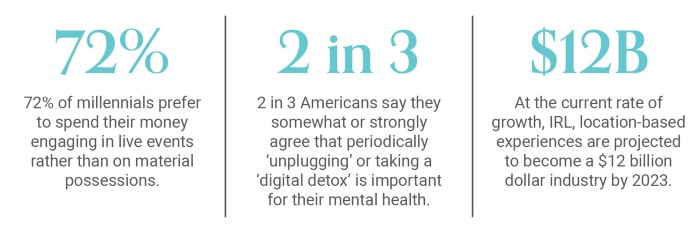 Tired of the endless scroll, people are realizing that memories are made offline. According to projections from Greenlight Insights, at the current rate of growth, IRL, location-based experiences are projected to become a $12 billion industry by 2023.