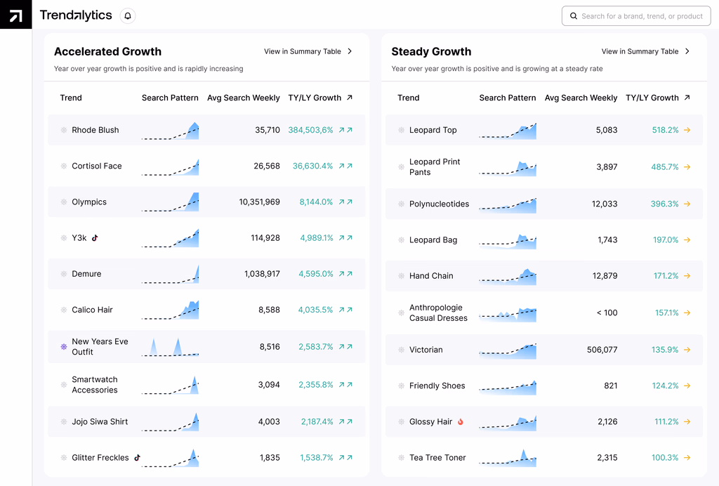 Access a real-time dashboard of accelerating, growing, peaking and declining trends. Track trends as far back as 4 years.